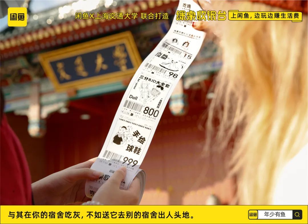 受上海交通大学媒体与传播学院邀请, 我们与闲鱼、上海交通大学共同创造, 「课桌收银台」 我们将课桌与另一生活常见的元素收银台相结合, 在新学期, 闲鱼为大学生提出一种全新的校园生活方式 ——上闲鱼,边玩边赚生活费。 无论是有一技之长还是脑洞大开, 不管是专业知识过硬还是充满浪漫细胞, 闲鱼在手,校园处处是机遇! 让大学生「 年少有鱼」 ——生活费月月有余。 在「课桌收银台」的概念下, 我们不止是提出倡议, 更是真实呈现大学生应该如何赚取生活费! 收银小票成为学生们赚生活费的Tips。 启发更多学生在闲鱼赚生活费的新思路, 让生活费到账不成问题。