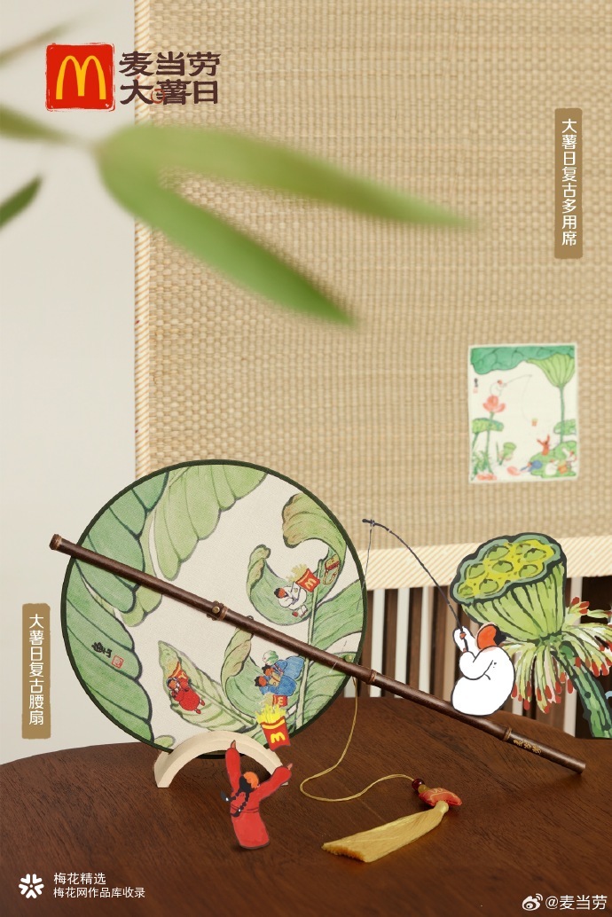 一年一度的麦当劳大薯日如约而至,今年麦当劳携手艺术家鱼山饭宽带来两款「中式纳凉」周边——复古多用席、复古腰扇,希望能通过「以薯消暑」的方式为大家带来清凉。