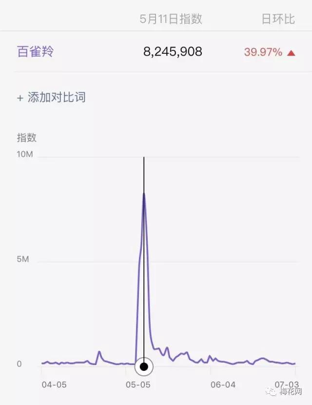 老品牌百雀羚走上年轻化的道路后就一去不复返了。今年5月,百雀羚凭借一组一镜到底的神广告刷遍朋友圈,一名1931年的老上海的摩登女郎,看似街头漫步,实则是完成一项谋杀任务,万万没想到最后神转折广告植入,才发现是来自百雀羚的广告。网友惊呼简直脑洞大开,老奶奶不扶,就服百雀羚!几乎同一时间,百雀羚在2017上半年的微信热搜指数也达到了最高峰值,厉害了,wuli雀雀!