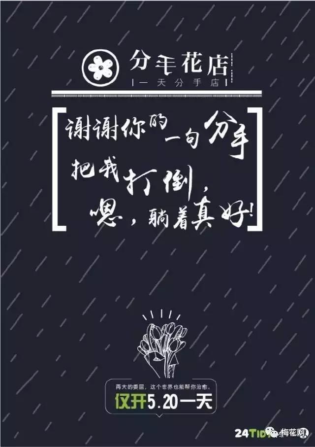今天你小确"丧"了吗?就让我们躺一躺,躺尸到死亡……正当"丧茶"热潮退却后,一家分手花店却又在520横空出世,别人都在忙着表白,这家花店却独独面向失恋人士。同样的快闪的形式,只营业一天,但却被粉丝们挤到爆,"生活不止眼前的苟且,还有前任的请帖",光看文案,就已经虐到哭。