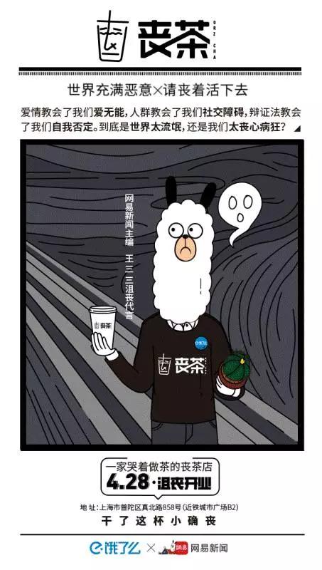 如果说鸡汤是中老年朋友们的朋友圈爆款,那么"丧"很可能正在刷屏年轻人的朋友圈。五一期间,网易新闻联盟手饿了么开启了一家"丧茶"快闪店,世界充满恶意,请丧着活下去。再看"丧茶"点单,简直丧的惊天动地!