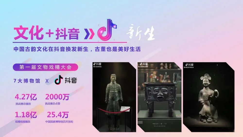 典型的例子,可以说是5月18日,中国国家博物馆与七家地方博物馆,联合抖音一起推出的“第一届文物戏精大会”H5,各大博物馆的文物集体唱歌跳舞变戏精的视频,刷爆朋友圈。各个博物馆的账号也因此大幅涨粉,其中中国国家博物馆四天涨粉25.4万个。