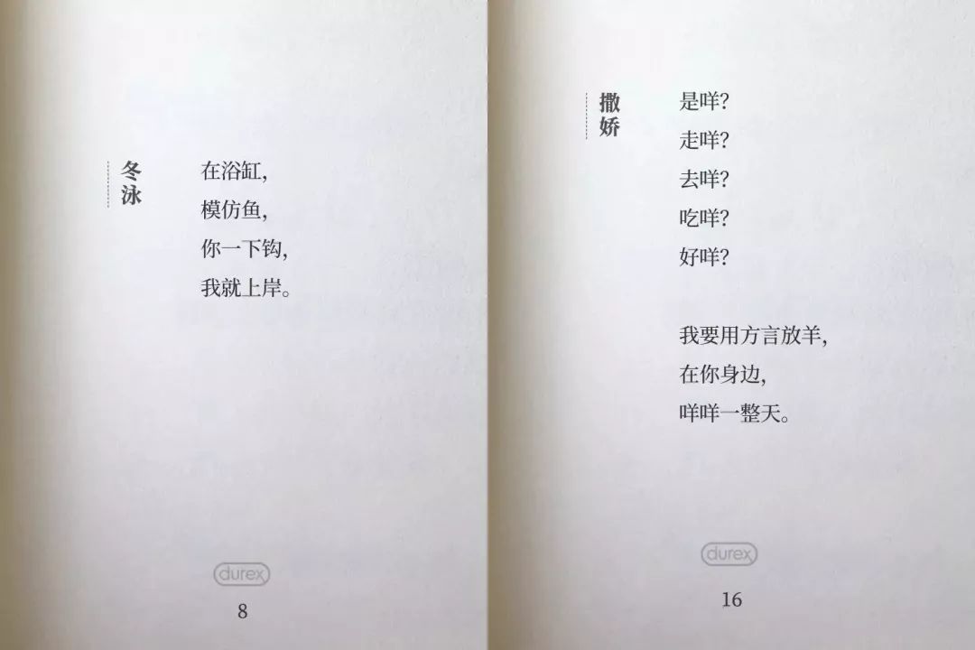 杜蕾斯诗集一共春夏秋冬四册,春天是《我不是一个没有感情的杀手》,夏天是《爱人住在猫尾巴上》,秋天是《华丽人类 朴素情史》,冬天是《综上所述,》。一共60首诗,细细品味,每一首都是爱情啊~