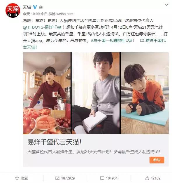 4月11号,天猫官宣易烊千玺成为天猫首位代言人,同时表示,天猫理想生活全明星计划正式启动,天猫21天元气计划上线。自4月12日0点开始的21天内,易烊千玺将在天猫「直播」自己的元气时刻,以日常生活中的真实姿态,呈现他心目中的理想生活,刷爆你的每个早晨!