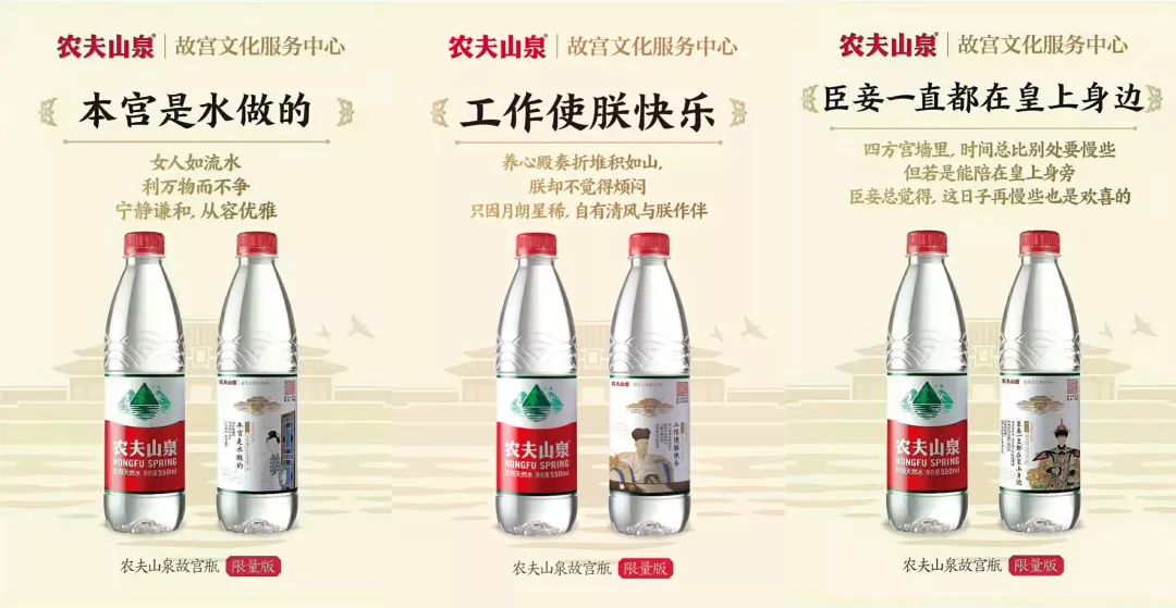 这是农夫山泉携手故宫文化服务中心,推出的限量版“农夫山泉故宫瓶”。一共九款,设计灵感来自九幅馆藏人物画作,配以现代化温情解读,让你与宫廷中的帝王后妃们“瓶”水相逢。