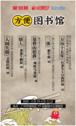 在世界读书日前几天,kindle官方晒出了线下活动的预告:看《情人》沉浸在青涩微甜的初恋中,而牛肉竟然吐槽了自己口感已老。还有《万历十五年》的煎熬竟然熬出拌面?《基督山伯爵》中复仇的快感在辣味乌龙面中也能体会?