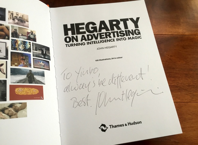 《Hegarty On Adevertising》这本书是我们BBH创始人John Hegarty写的。他送给我的时候提了一句话,他说:寅波,Always be different. 永远保持不同。