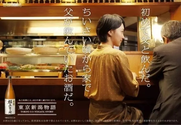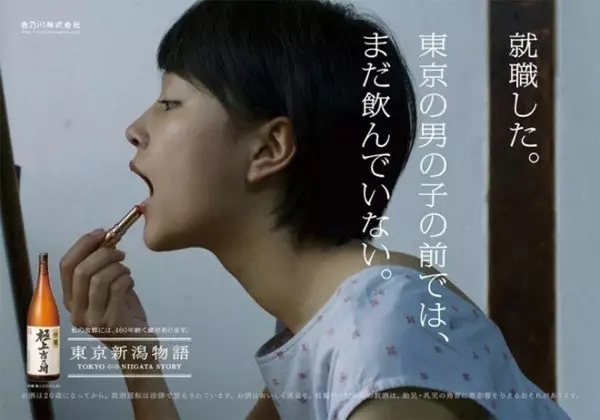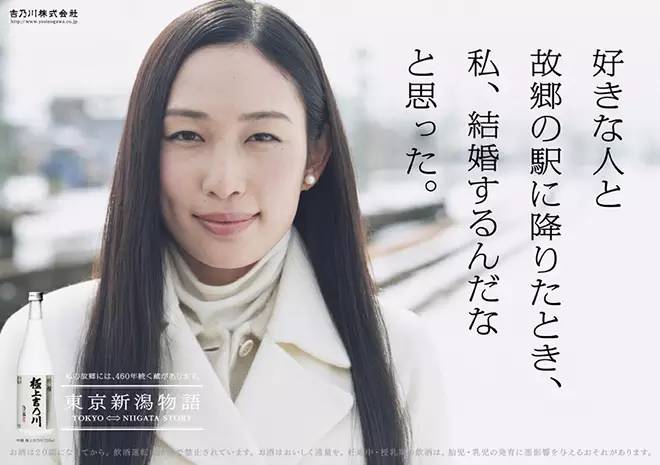 日本一个叫"吉乃川"的酒厂,为了打开女性市场而推出一系列海报。文案都是女性的内心独白,海报的主题--"东京新潟物语"所说的,就是这一段路程中丰富而微妙的心情,从2011年开始,以系列海报的形式出现在新潟到东京的上越新干线车厢内。