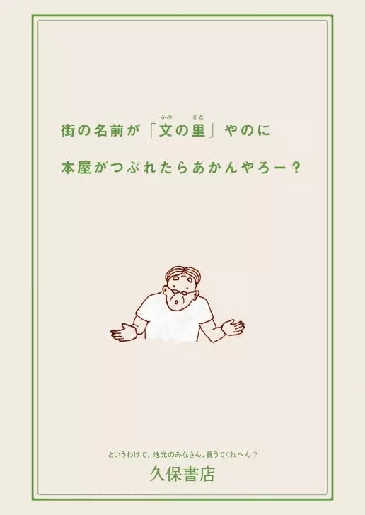 因为不擅宣传、地段较偏,加上越来越多的超市、便利店的市场分割,日本很多老商店已经门庭冷清,「文の里久保书店」便是其中一家。为了拯救商店,他们找来关西的大型广告公司KeitaKusaka帮忙企划一个海报设计大赛。最后出来的海报效果很好,文案有趣,设计写实,甚至有不少外地人大老远跑去,只为看看这些海报。