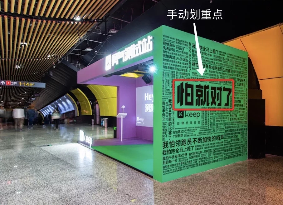 本次Keep的传播战役也不例外,围绕#怕就对了#概念,线上线下都做了一些延展了,线上有在微信端feed流,Keep社区的打卡活动,微信和微博上的话题讨论,同时线下,地铁站公交车站内展示长版本、短版本两套视觉海报及线下的打卡活动等。