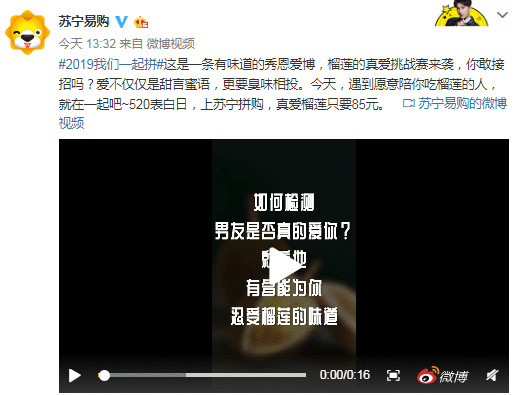 5、苏宁易购:一个有味道的秀恩爱视频,520吃真爱榴莲,这是要把不吃榴莲的人逼上梁山吗?哈哈哈哈哈哈哈哈……