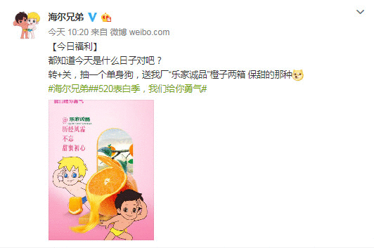 2、海尔兄弟:关爱单身汪,人人有责,包甜的橙子今天只属于单身的仔!