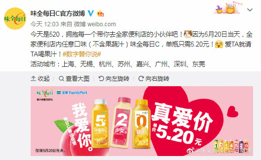 4、味全:520当天,全家便利店味全每日C,单瓶只需5.20元。暗戳戳得带小伙伴去买,TA会懂你的意思吗?