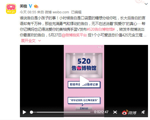 1、美柚:#520告白博物馆#以博物馆之名,行告白之举。小奶狗、小狼狗、霸道总裁、暖男、学渣、学霸、男友未满的、腼腆的、直接的……各种类型的告白,就问你心脏还好吗?!