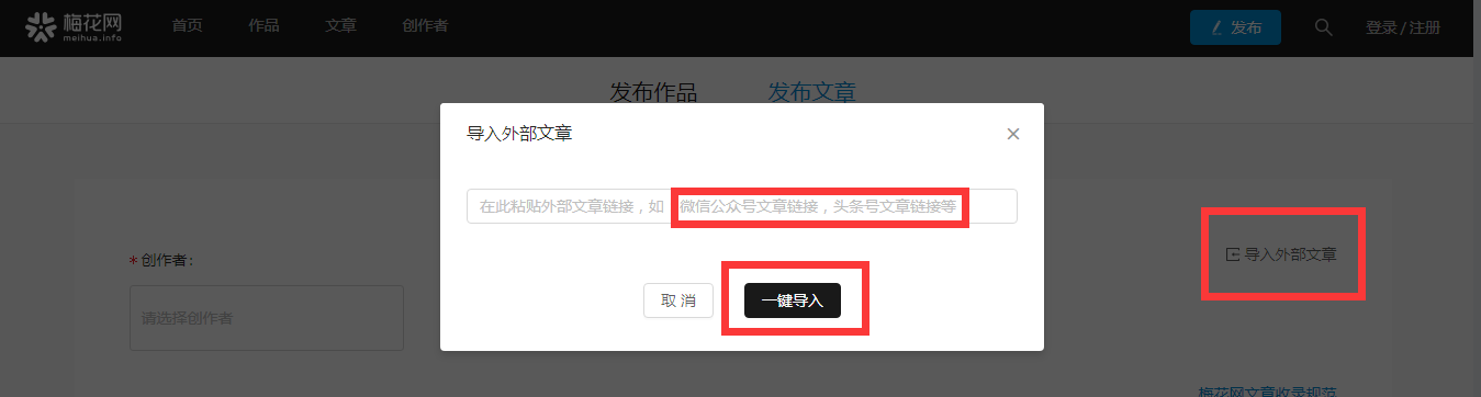 第四步:如果您的文章已在其它平台编辑或者发布,可以使用【一键导入】功能,将原文章迁移过来。目前支持微信公众号、头条号等外部链接。