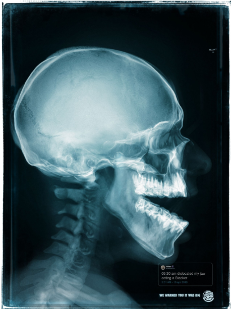爱搞事情的汉堡王又"自黑"了一把。4月,汉堡王公布了一组吃汉堡王吃到下巴脱臼的消费者X光片,在每张X光片下面都有每位受害者的吐槽留言。