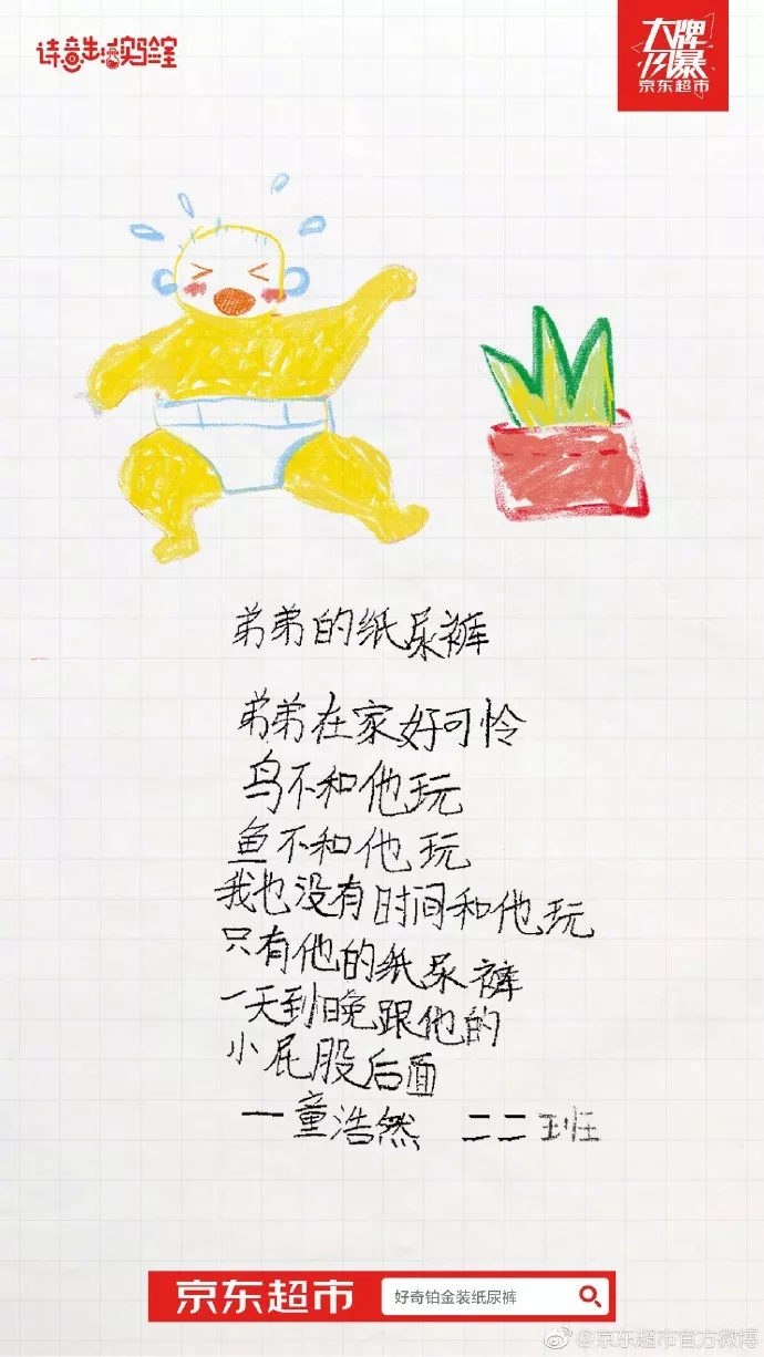 2019开年之际,京东超市推出了一组特别的主题海报#2019诗意生活#,上面的文案全部来自都是小学生、幼儿园小朋友笔下的诗歌作品。
