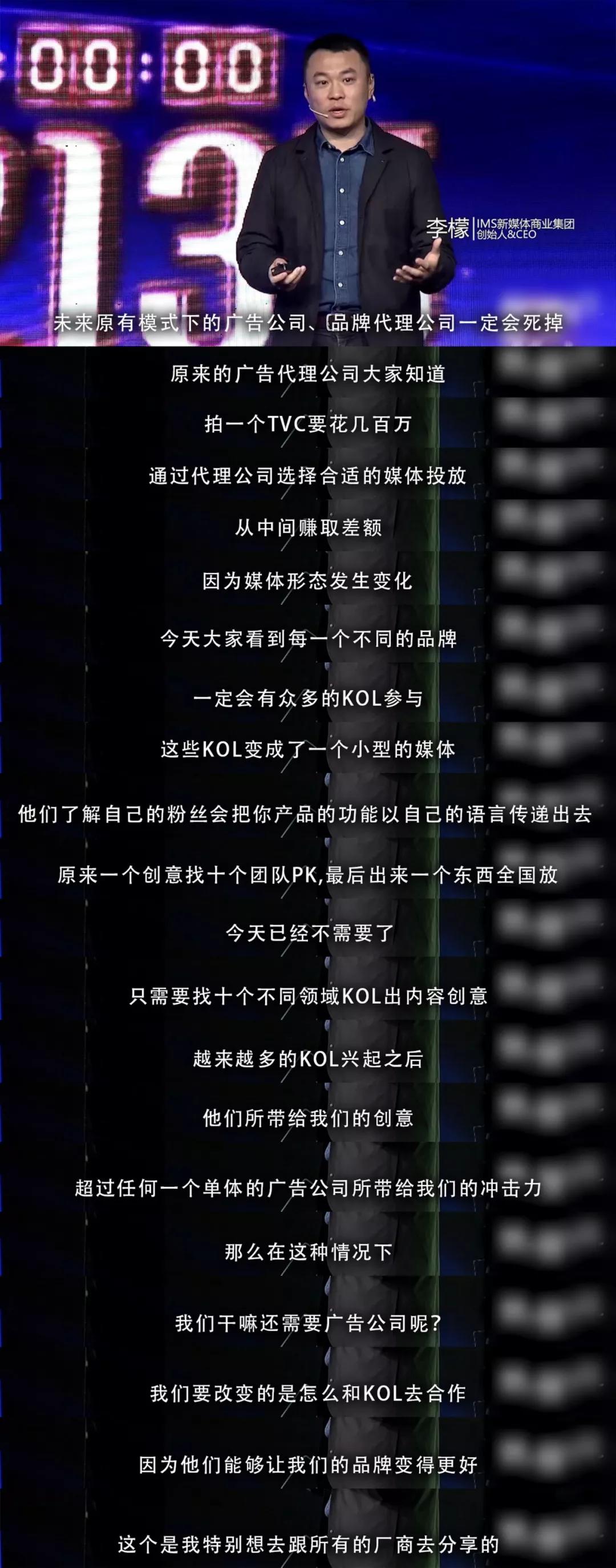大致意思如下:在未来,靠制作TVC,平面广告、找代理公司做媒介投放并从中赚取差价的广告公司会被网红取代。