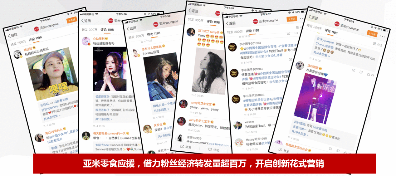 可以说,借由精准的粉丝交互行为,亚米将品牌演化为明星与粉丝之间的连接纽带,其产生的不仅是一次性消费行为,更唤起了消费者在情感方面的共鸣。而其"空手套白狼"式的现象级营销,恰恰得益于此。