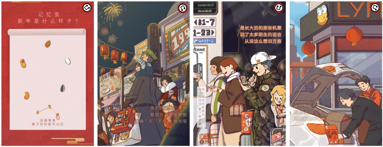 另一方面,来伊份在年货节的营销过程中推出了一条极为走心的H5动画。该条H5以唤醒读者的新年记忆为主脉络,主打"温情牌",每一段文字都直击大众的生活场景,可谓是"不突兀,不矫情"。
