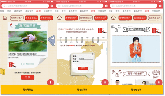 如在《雀巢-热血高考季》案例中,网易有道通过大数据洞察发现,app上最大的流量集中在在考试季、开学季等等,这些时间点也是学生很辛苦或者压力比较大时候,深知到此关键节点,网易有道从考前40天、60天、100天,深入洞察目标用户的生活场景与心理需求,设有励志性的高考每日签、全民加油鼓励的高考加油站等环节,与学生们打成一片。