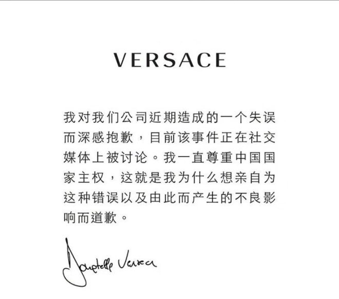 8月11日下午,范思哲在其海外社交媒体账号Instagram、推特及脸谱等多个官方社交账号上发布中、英双语道歉声明 ,并附上品牌继承人暨创意总监Donatella Versace的道歉信:“我对我们公司近期造成的一个失误而深感抱歉,目前该事件正在社交媒体上被讨论。我一直尊重中国的国家主权,这就是我为什么想要亲自为这种错误以及由此造成的不良影响而道歉。”