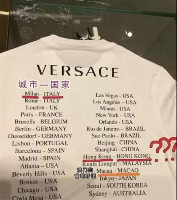 近日,有网友发现Versace范思哲一款T恤将中国香港、澳门列为国家,引发广泛关注。