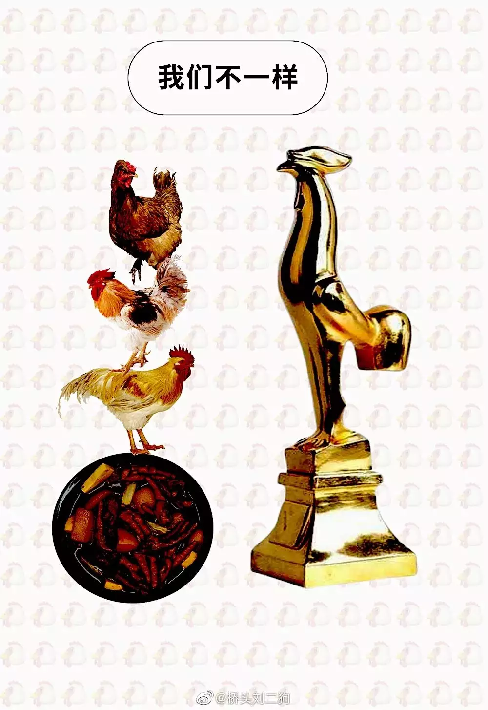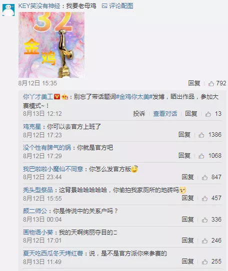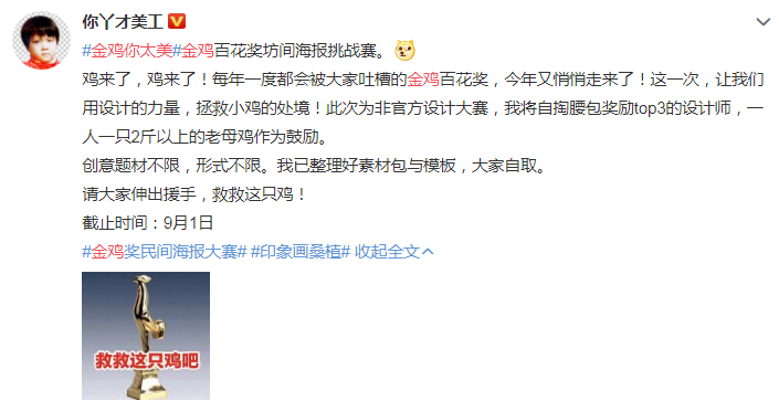 一位十分具有“奉献精神”的网友,拿出3只老母鸡做奖励,办了一场#金鸡百花坊间海报挑战赛#来拯救这只小鸡(金鸡奖)。