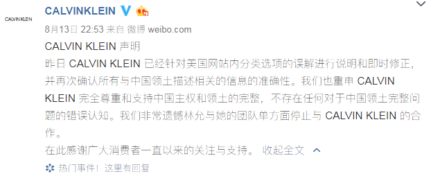 昨日 CALVIN KLEIN 已经针对美国网站内分类选项的误解进行说明和即时修正,并再次确认所有与中国领土描述相关的信息的准确性。我们也重申 CALVIN KLEIN 完全尊重和支持中国主权和领土的完整,不存在任何对于中国领土完整问题的错误认知。我们非常遗憾林允与她的团队单方面停止与 CALVIN KLEIN 的合作。