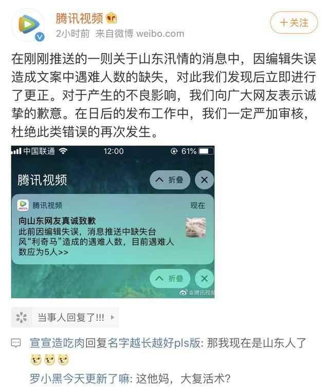 随后,腾讯视频官博发布道歉微博,称在推送的一则关于山东汛情的消息中,因编辑失误造成文案中遇难人数的缺失,对此我们发现后立即进行了更正。对于产生的不良影响,我们向广大网友表示诚挚的歉意。在日后的发布工作中,我们一定严加审核,杜绝此类错误的再次发生。
