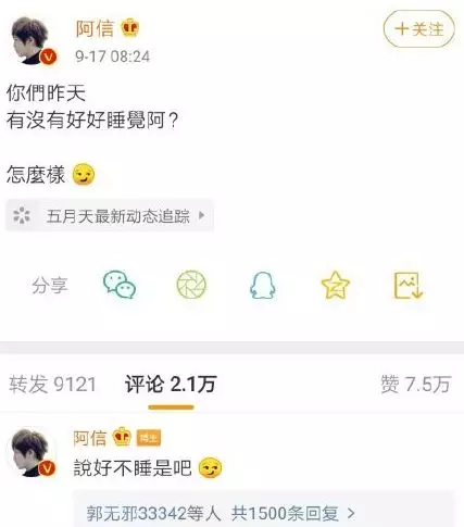 今天早上,阿信再次来到微博,为周杰伦的新歌打call。