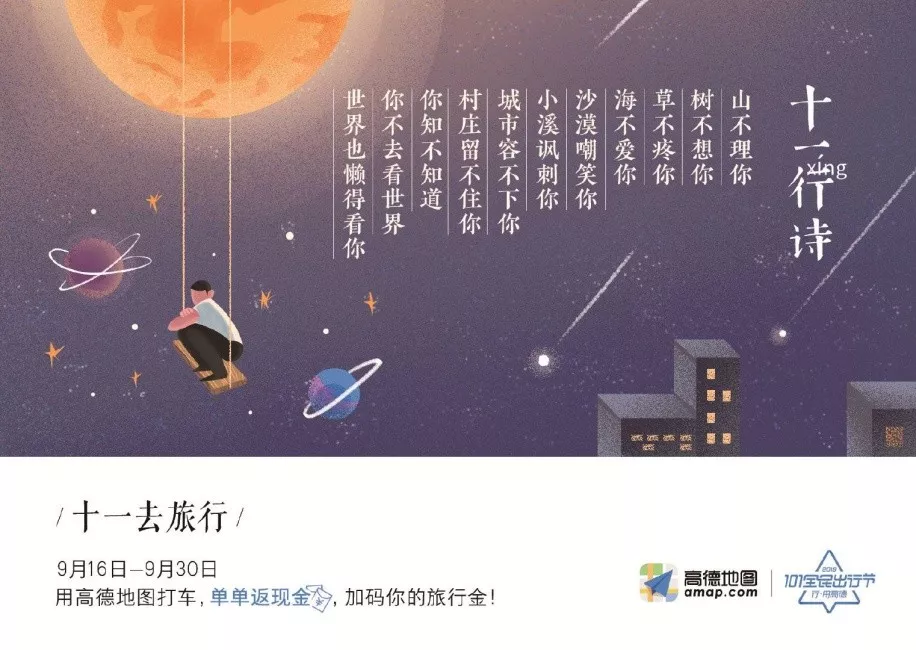 十一长假马上就到了,又是一年出游季。高德地图为了鼓励大家出门看世界,推出了一套十一行诗,并将诗意的元素延伸到了海报上。海报中如诗如画的意境,激起了不少网友心中的涟漪。