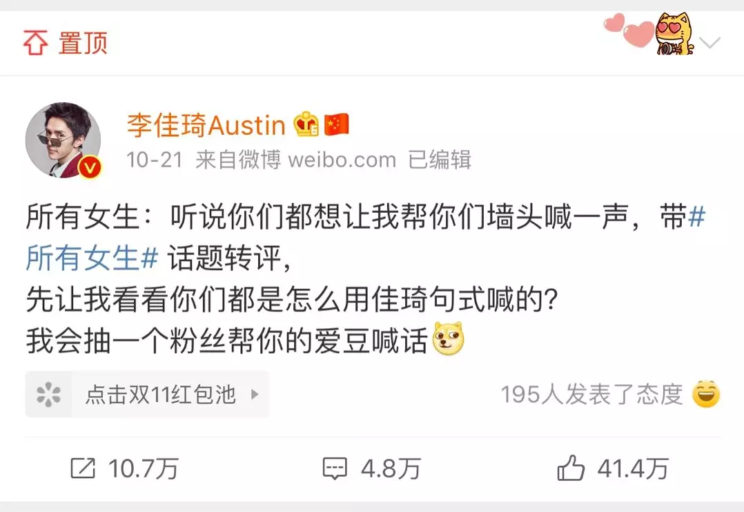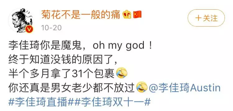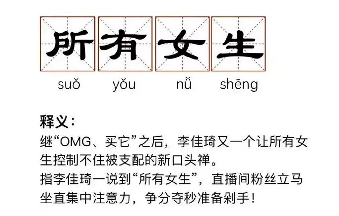 与此同时,一个关于#所有女生#的话题热度也蹭蹭上升,原来是李佳琦的一句口头禅,网友纷纷调侃:“只要他一喊‘所有女生’,我就觉得我是一个女兵,乖巧听话”。