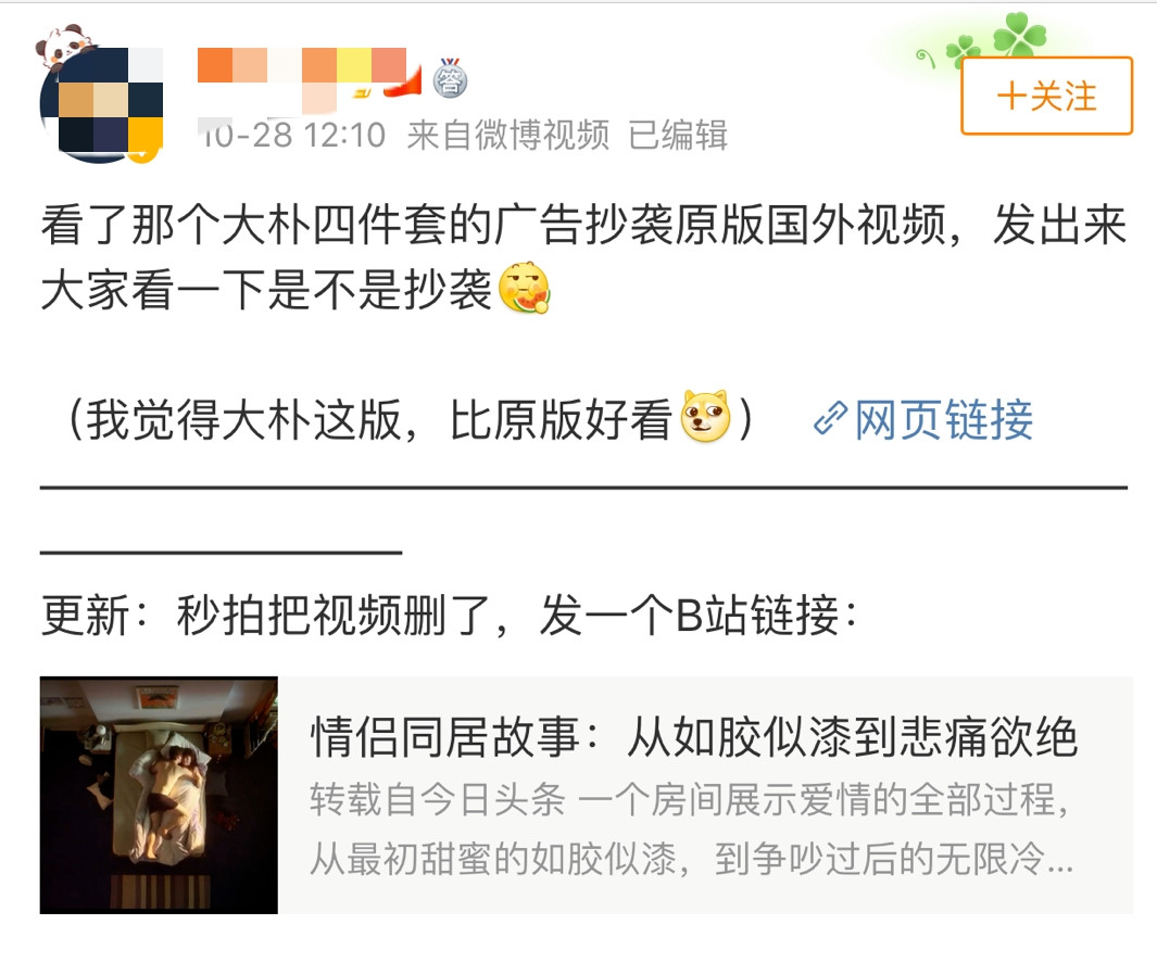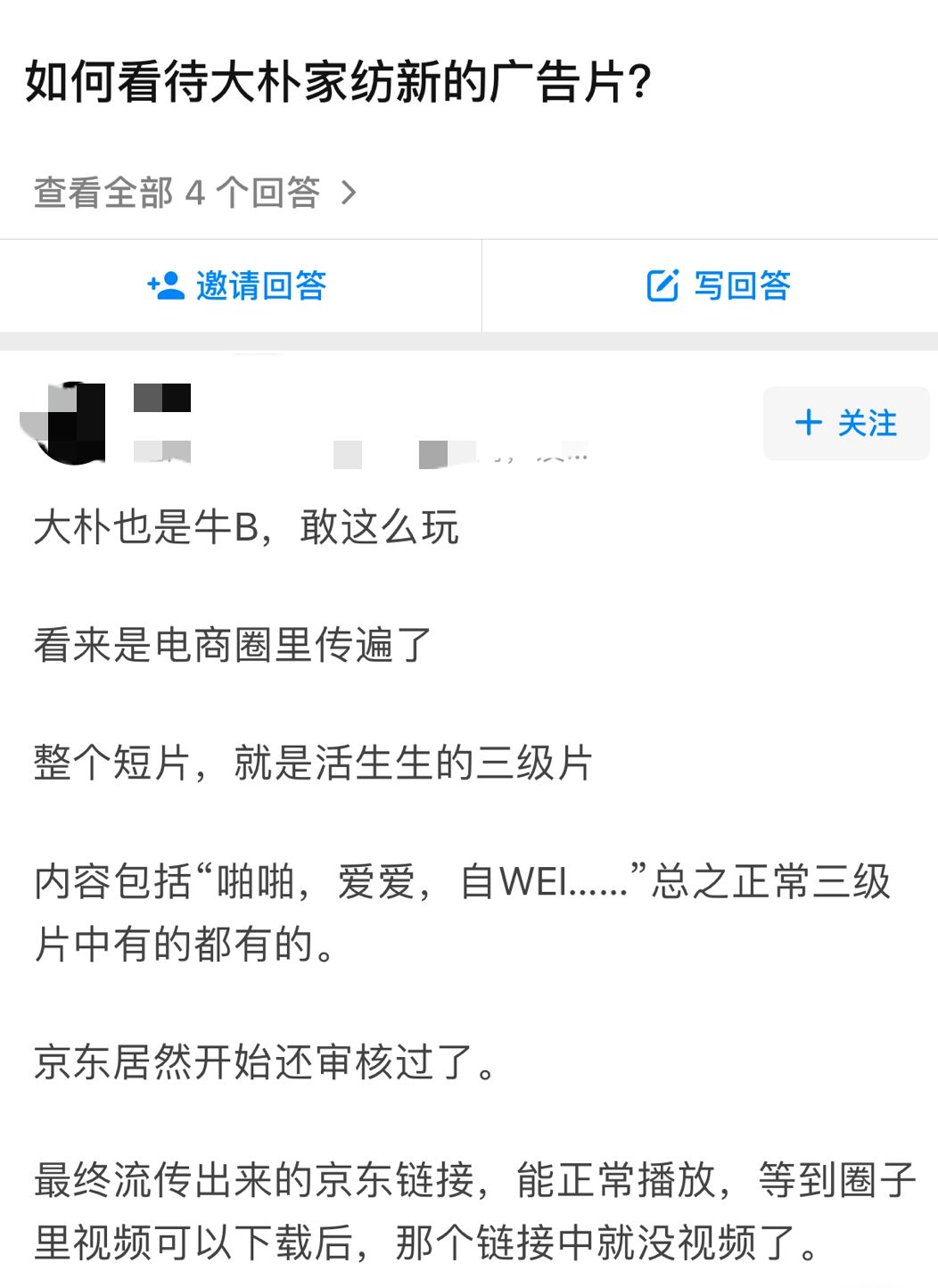 10月27日晚,大朴(床上用品品牌)在京东的店面首页,上线了一支广告片。该视频立即在微信、微博、知乎、豆瓣等平台引起议论,并在随后被火速撤下。