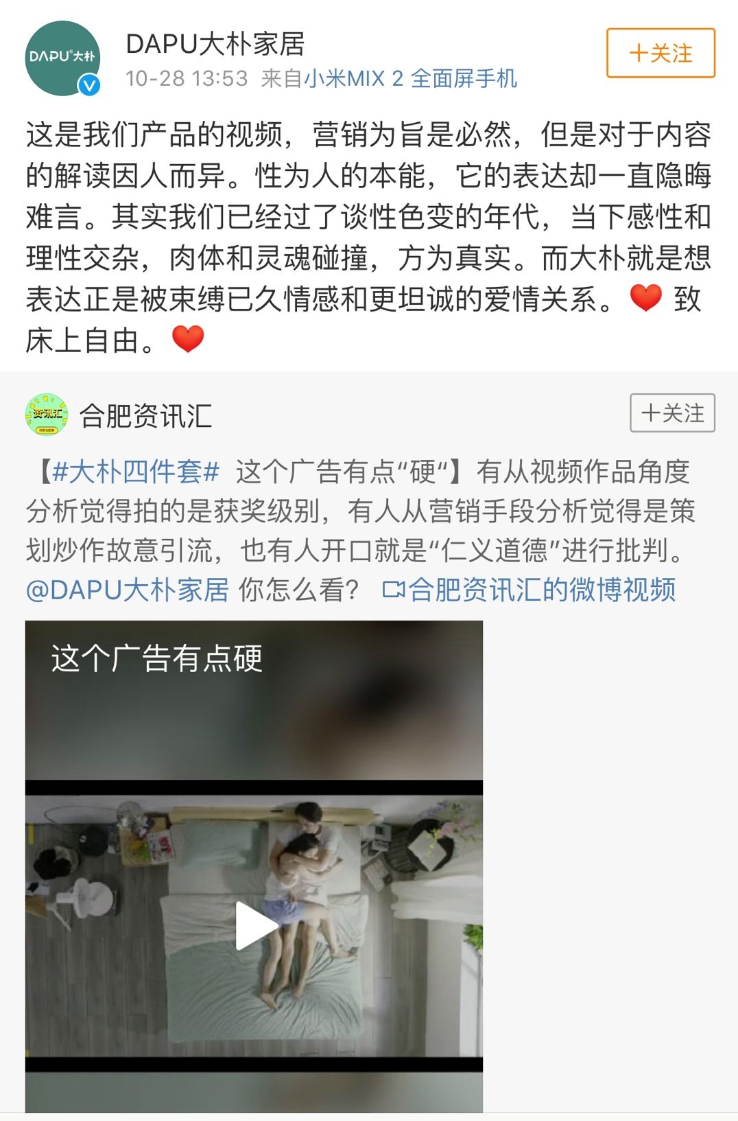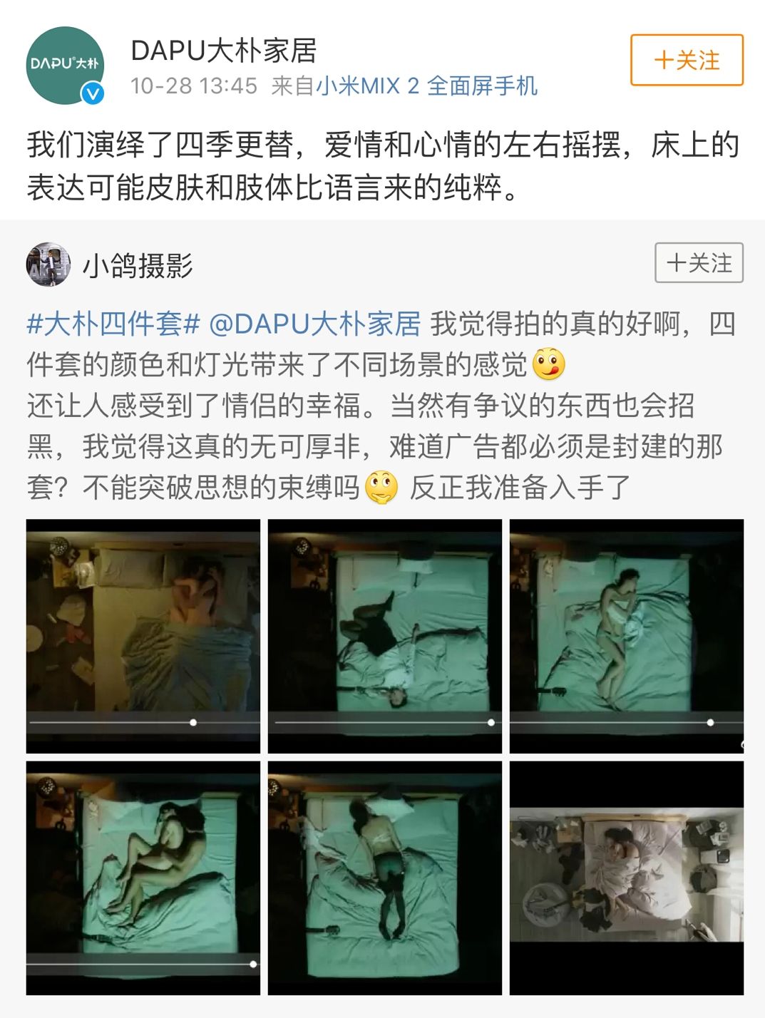 而大朴家具本次四件套广告,主推的显然就是床上用品四件套,是否适合与性结合也是个值得探讨的问题。正如网友观点上两极的分化,有人认为大胆而新颖,有人则表示无法接受,直接拉黑。