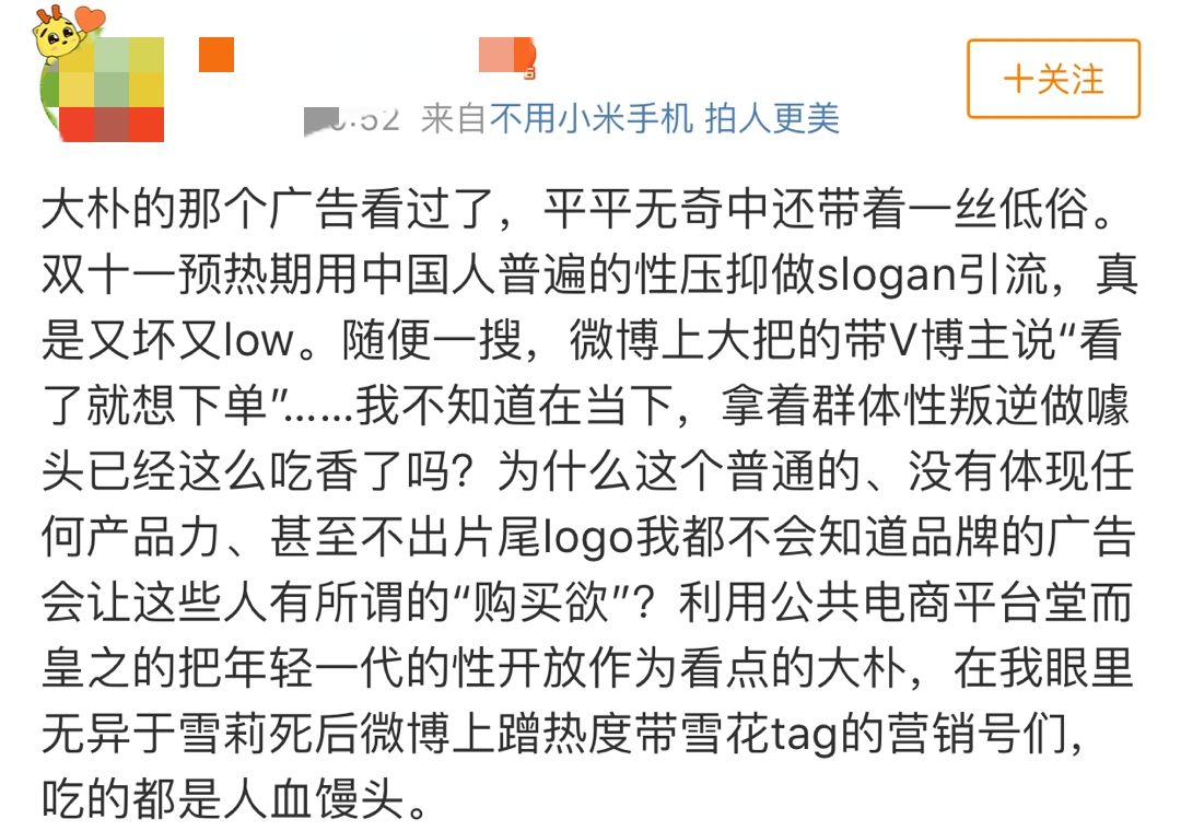 而且认为大朴的广告,平平无奇中还带着一丝低俗,真是又坏又low。