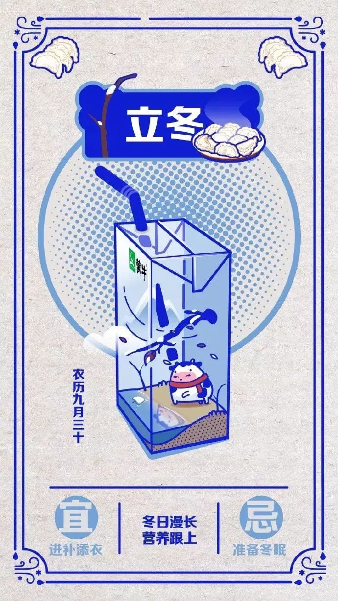 1.品牌主推出有关立冬、小雪、寒衣节的H5、海报,主要元素是保暖,提示穿秋衣,贴秋膘,立冬吃啥,因为是中国的节气,可以借用中国风的元素。