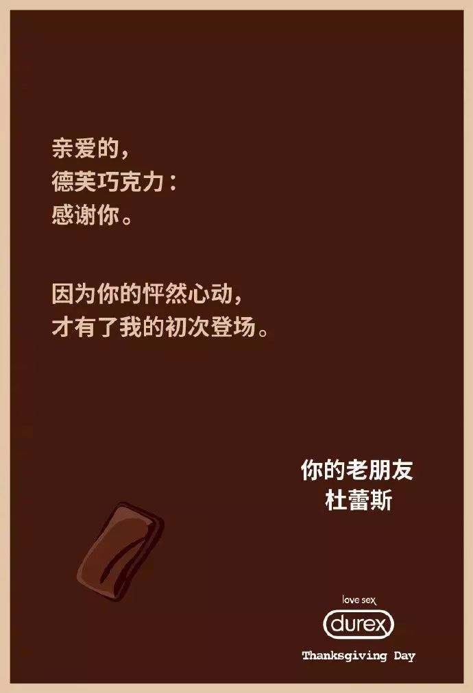 2.感恩也有着"谢谢"的中文释义,这个角度也可以借用。杜蕾斯就借用了"谢谢"的文字形,虽然有点污,但也不缺趣味。