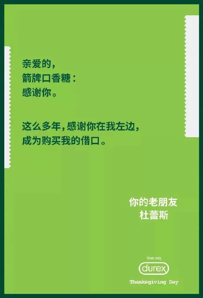4.去年的感恩节,杜蕾斯还玩了一票大的,向很多品牌感恩,来了一次联动。