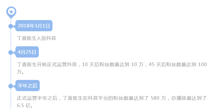 丁香医生作为抖音平台的冷门领域——健康领域,在短短半年时间内拥有粉丝580 万,总播放量达到了6.5亿,迅速站稳脚跟。