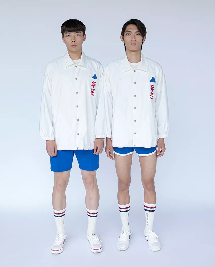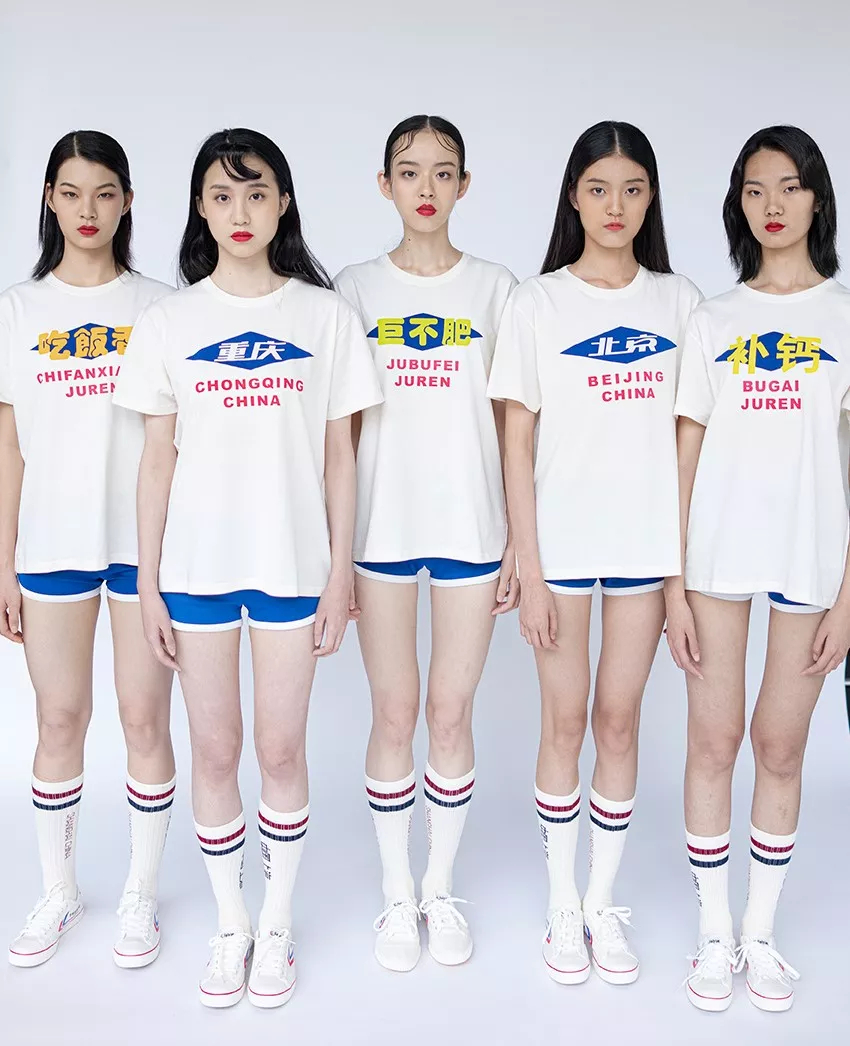 除了这扑朔迷离的画质与飘忽闪烁的黑点,联名款的年代感还体现在了服装正面的大白话上:补钙,巨不肥,吃饭香,吃饭香,祝您健康...