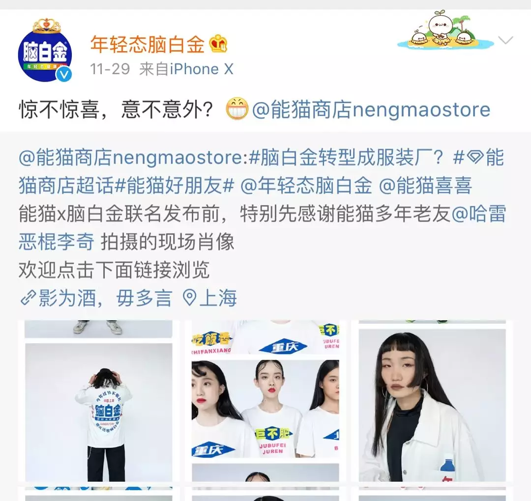 而脑白金的这次联名出衣服,也是如出一辙,想要通过新鲜的组合博得年轻人的关注。