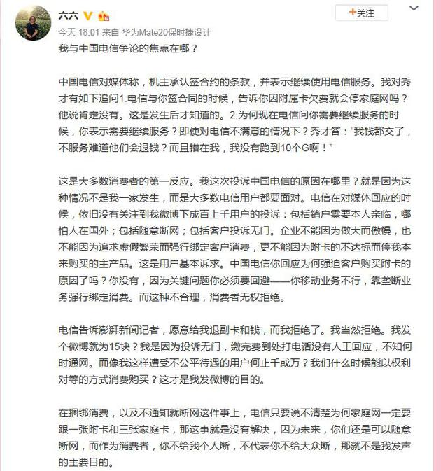 然而,12月6日,作家六六再发文质疑电信,表明自己与中国电信争论焦点,拒绝中国电信退副卡和钱,因为投诉无门。文章称,电信只要说不清楚为何家庭网一定要跟一张附卡和三张家庭卡,那这事就是没有解决,因为未来,你们还是可以随意断网,而作为消费者,你不给我个人断,不代表你不给大众断,那就不是我发声的主要目的。