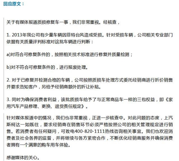 12月6日,上汽大众斯柯达做出回应,并承认2013年该公司有少量车辆因“菲特”台风造成受损。针对受损车辆,斯柯达依据有关质量评判标准对这批车辆进行判断:对于可修复的车辆进行修复并质量检测;对于不可修复车辆进行报废处理。