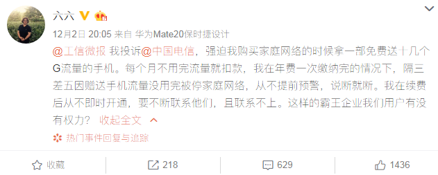 近日,知名作家六六在微博投诉中国电信,称其购买家庭网络时被强迫拿一部免费送十几个G流量的手机,每个月赠送的额定流量不用完就扣款。