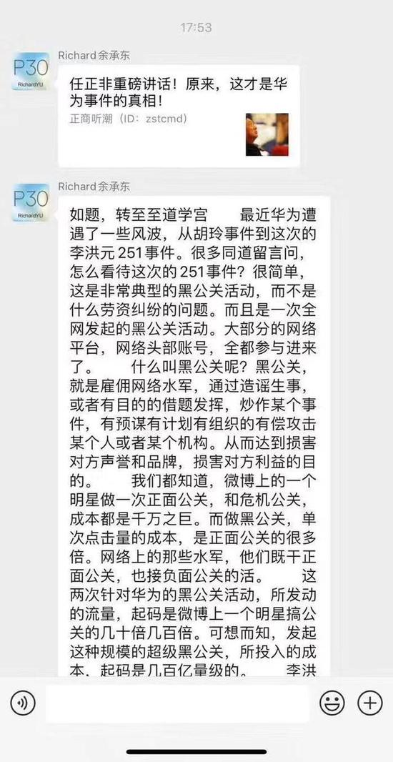 12月4日,华为消费者业务CEO余承东在社交媒体转发《针对华为的黑公关狂欢》文章。该文章称华为最近遭遇的舆论风波是非常典型的黑公关活动。其背后黑手,第一是美国,第二是竞争对手,第三是媒体平台。