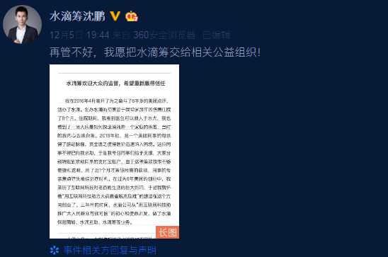 公开信中,@水滴筹沈鹏 回忆了自己离开美团点评、创立水滴筹的初衷和经历,表示在11月30日看到相关报道后,第一时间就成立了工作组展开相应调查,并且全面暂停了线下服务,对辜负了爱心用户的信任感到很抱歉。