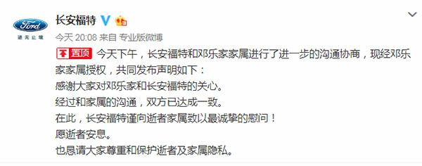 12月22日长安福特官方微博发布声明称,长安福特和邓乐家家属进行了进一步的沟通协商,现在双方已达成一致,也恳请大家尊重和保护逝者及家属隐私。