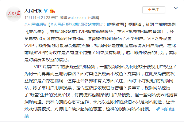 其中,人民日报多次对于视频网站“超前点播”的策略发表了批评,指责其吃相难看。