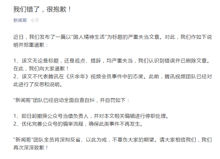 12月23日,腾讯“新闻哥”团队发布声明,称文章严重失当,认识到错误并已删除。“新闻哥”团队表示,该文无论是标题,还是观点、措辞,均严重失当,郑重道歉;该文不代表腾讯在《庆余年》视频会员事件中的态度。